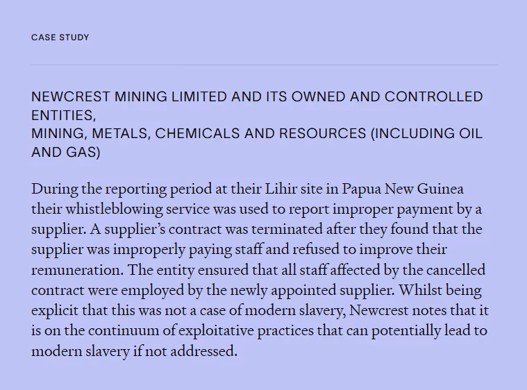 Strong statements by entities show examples of how grievance mechanisms addressing modern slavery were used, or expected to be used, where allegations of modern slavery are made.