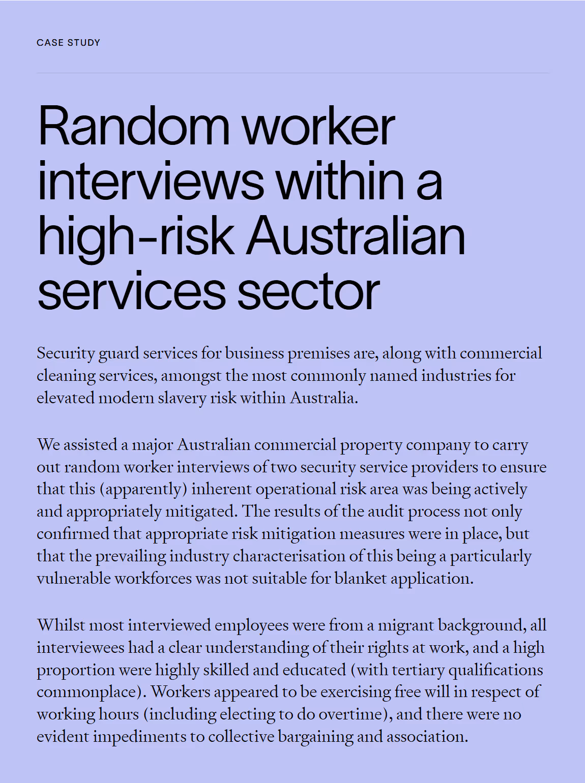 Although the published descriptions of such activities through subsequent modern slavery statements will (and should) almost invariably be anonymised and generalised (to protect commercial-in-confidence details and maintain trust for ongoing supplier relationships), the inclusion of such supplier-specific activities is often one of the clearest differentiating features that point towards an above-average modern slavery response framework.